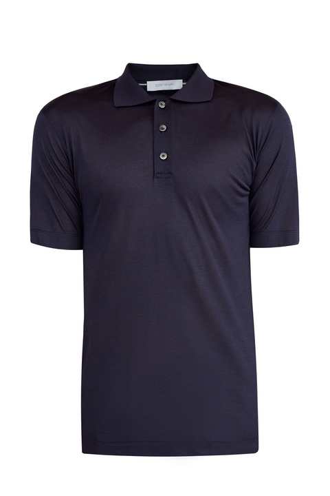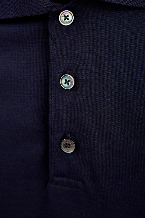Однотонная мужская футболка-поло в стиле минимализма от Cortigiani выполнена из джерси на основе чистого шелка с характерной гладкой поверхностью и благородным сатиновым блеском. Модель в глубоком сапфирово-синем оттенке дополнена отложным воротом из плотного трикотажа и застежкой на пуговицы из перламутра. Сделано в Италии.