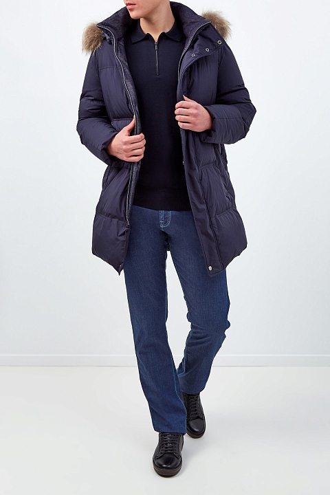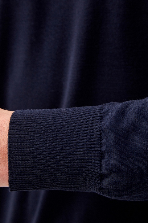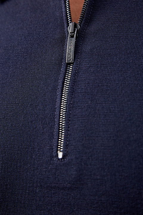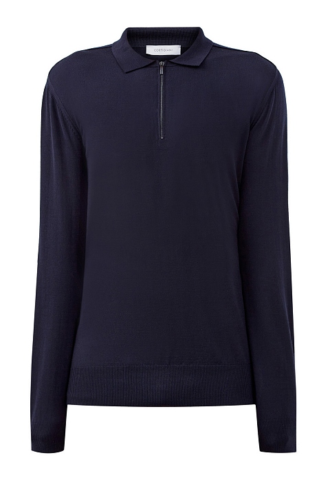 Минималистичный джемпер-поло от Cortigiani выполнен из шерстяной пряжи Super 140`s — благодаря кручению нитей ткань не образует складок, что делает модель идеальной для деловых поездок. Изделие в густом оттенке ночного неба с классическим отложным воротником и застежкой на молнию, скрытую под планками. Эластичные манжеты и нижняя кромка в рубчик обеспечивают посадку по фигуре. Сделано в Италии.