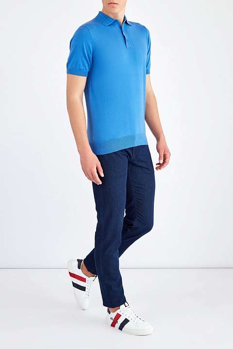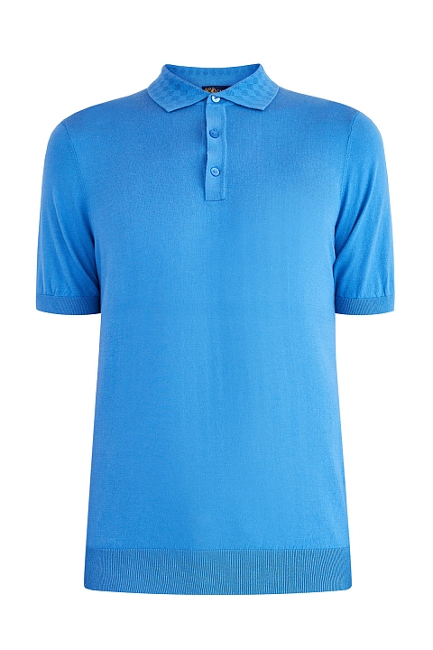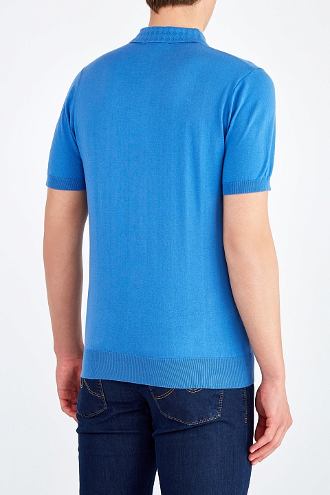 Однотонный джемпер-поло с коротким рукавом от Cudgi выполнен из мягкой хлопковой пряжи в приглушенном синем оттенке. Модель дополнена отложным воротником с фактурным ромбическим узором, а также традиционной застежкой на пуговицы. Манжеты и нижняя кромка в фактурный рубчик обеспечивают посадку по фигуре.