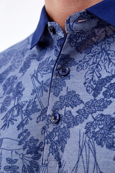 Мужская футболка-поло от Cudgi выполнена из натурального хлопкового пике в актуальной синей гамме. Изделие из мягкой фактурной ткани дополнено принтом с природным мотивом. Классический отложной воротник придает строгость повседневному образу. Декоративные разрезы по боковым швам обеспечивают комфорт в движении. Детали: короткие рукава, застежка на пуговицы, эластичная отделка кромок в рубчик.