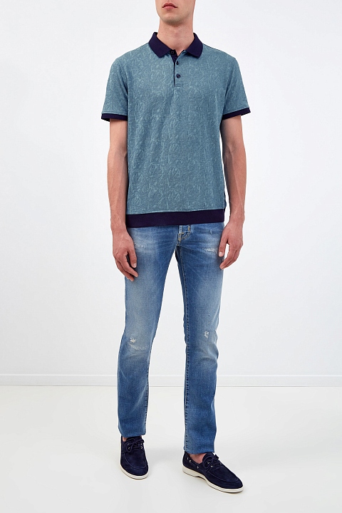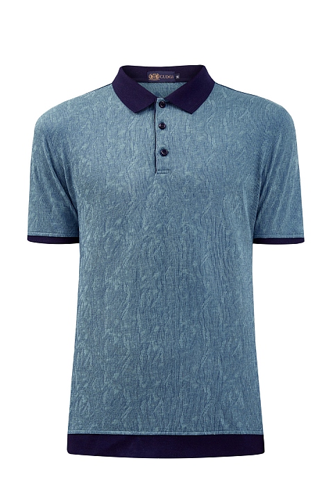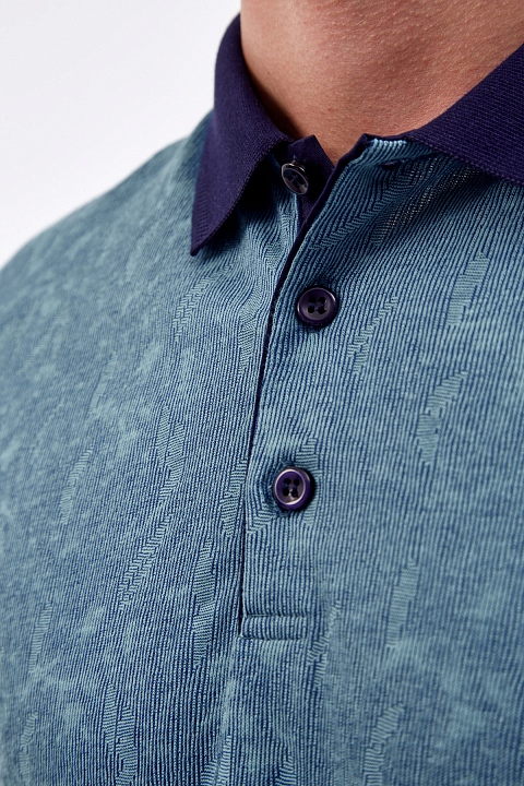 Мужской джемпер-поло от Cudgi выполнен в актуальном цвете морской волны. Мягкий хлопковый материал с добавлением эластичных волокон не стесняет движений и идеально подходит для летнего сезона. Прядение в одно сложение нити обеспечивает оптимальный вес изделия. Лаконичный принт по всей поверхности изделия придает расслабленный штрих повседневному образу. Детали: контрастная отделка кромок, застежка на пуговицы, классический отложной воротник.