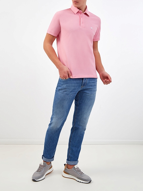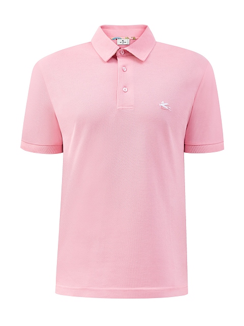 Мужское поло в стиле leisure от Etro выполнено из хлопка пике в оттенке сакуры. Полностью натуральный состав делает модель универсальным элементом базового летнего гардероба. Потайной принт под классическим отложным воротом вносит в образ неформальный акцент. Детали: застежка на пуговицы, вышитый логотип бренда. Сделано в Италии.