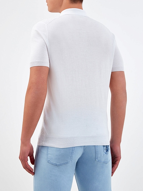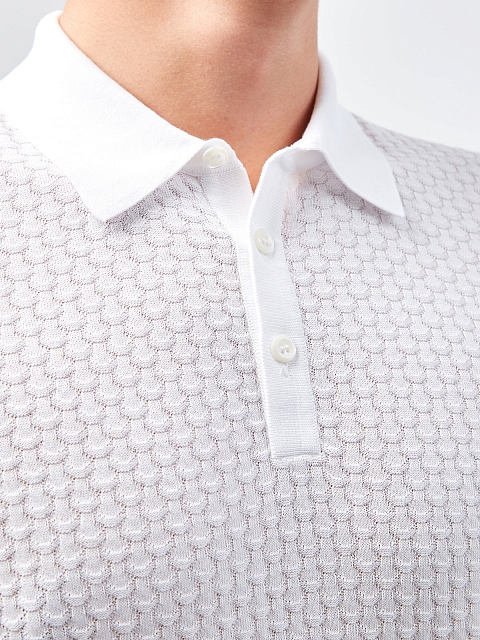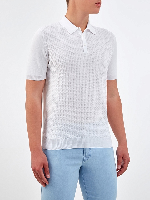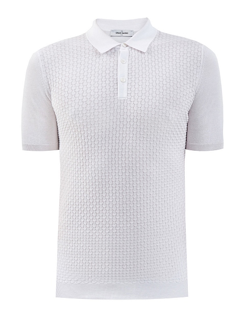Лаконичный джемпер-поло из хлопковой пряжи от Gran Sasso представлен в белом цвете, однотонное исполнение подчеркивает текстурный узор на передней планке. Модель с короткими рукавами и классическим уплотненным отложным воротом идеально подходит для создания повседневных образов. Детали: слегка облегающая посадка, эластичные манжеты и нижний край, застежка на пуговицы. Сделано в Италии.