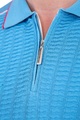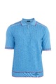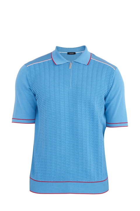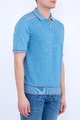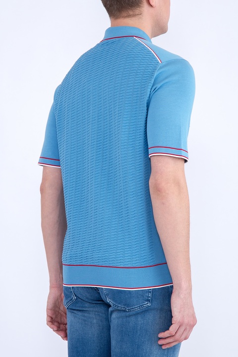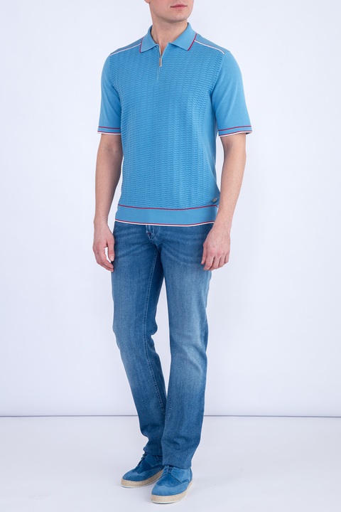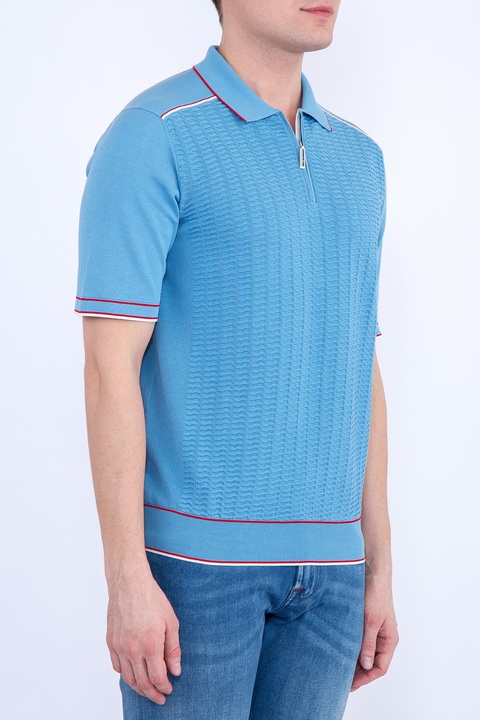 Стильное мужское поло Stefano Ricci, выполненное чулочной вязкой из трикотажных хлопковых нитей бирюзового тона. Модель характеризуется вставками спереди и на спинке с вывязанным фактурным узором. Традиционный итальянский воротник дополнен планкой на молнии с бегунком с символикой бренда. Нижняя кромка украшена эмблемой из палладия. Кромки и швы дополнены вставками красного и белого оттенков. Сделано в Италии.