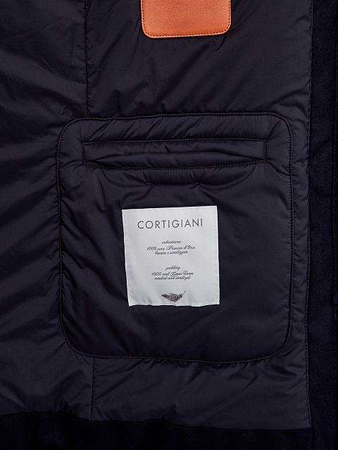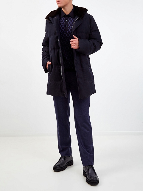 Пуховик в классическом стиле от Cortigiani выполнен из теплой шерстяной ткани. Внутренняя поверхность создана из непромокаемого и ветрозащитного нейлона, а набивка из гусиного пуха сохраняет комфорт в условиях низких температур. Съемная отделка из густого меха бобра делает дизайн еще более универсальным. Детали: прорезные карманы на молниях, двойная линия застежки. Сделано в Италии.