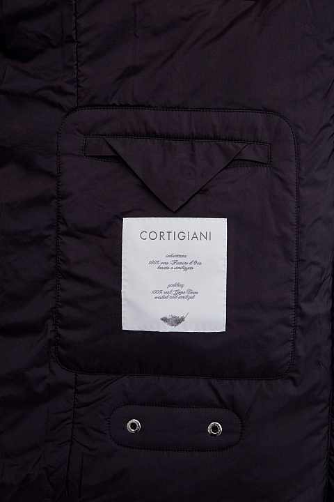 Пуховик в классическом стиле от Cortigiani. Модель сочетает из водонепроницаемый матовый нейлон и вставки из шерстяной фланели с peach-эффектом. Утеплитель из пуха позволяет с комфортом носить модель даже при низких температурах. За счет универсальной длины изделие органично смотрится в том числе с блейзерами и пиджаками. Функциональный дизайн предусматривает съемный воротник из меха бобра, а также прорезные наружные карманы. Строгие линии подчеркивают хлястики на рукавах. Детали: отделка из натуральной кожи, двойная застежка. Сделано в Италии.