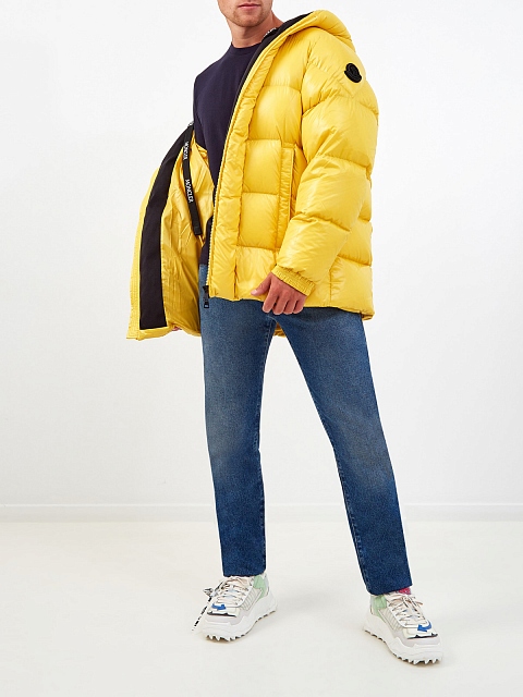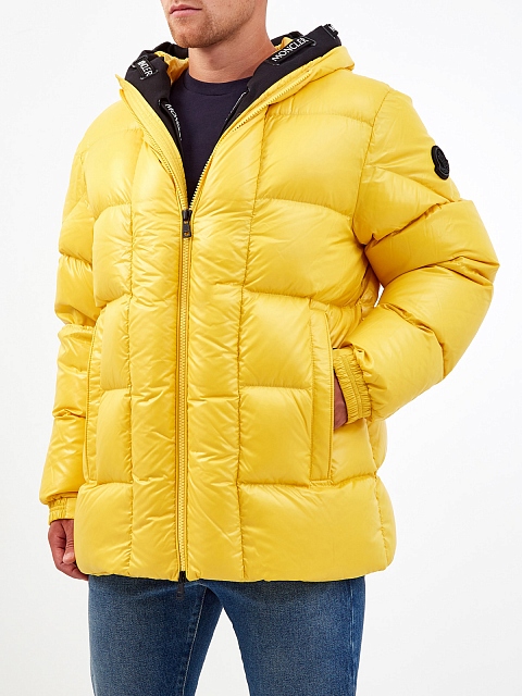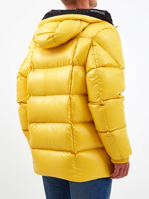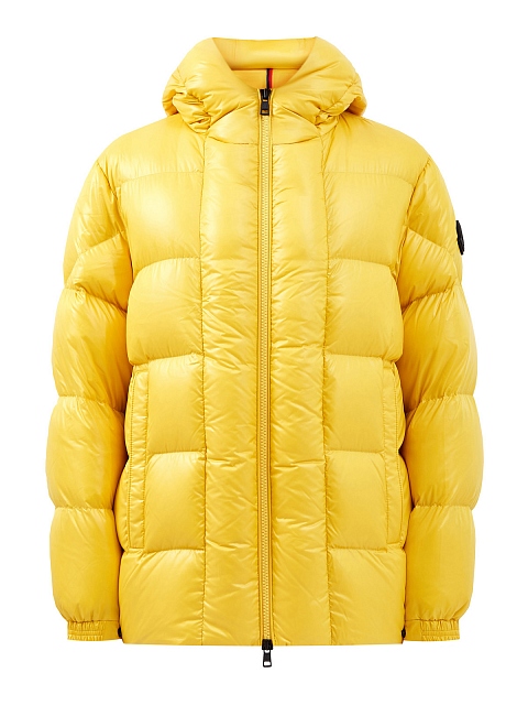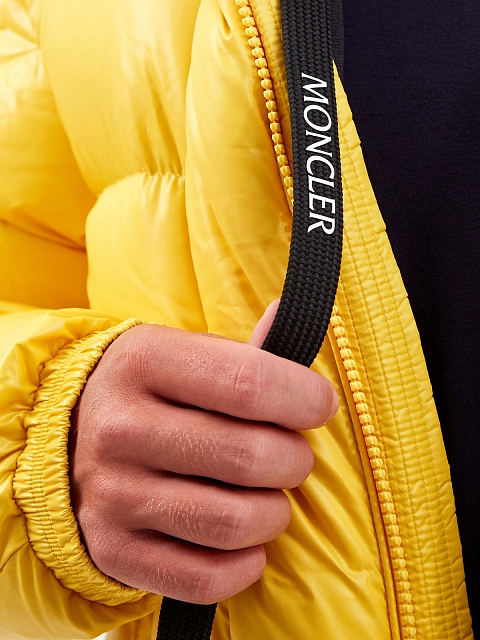 Эффектный мужской пуховик от Moncler создан из нейлона Laque с горизонтальным стеганым мотивом. Модель в ярком лимонном оттенке с глянцевым блеском характеризуется наполнителем из гусиного пуха, введенным методом прямой задувки. Контрастная внутренняя отделка с эластичной лентой-кулиской на капюшоне подчеркивает присущую бренду динамику. Детали: логотип из фетра, застежка на молнию с двойным пуллером, прорезные карманы.