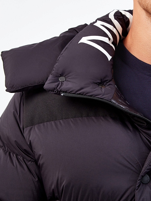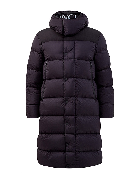 Удлиненный пуховик Hanss от Moncler выполнен из матового водонепроницаемого нейлона Longue Saison. Наполнитель из пуха и пера обеспечивает комфорт в условиях низких температур, подкладка из блестящего нейлона laqué дополнительно защищает от ветра. Динамичный акцент в образ вносит контрастная монограмма бренда и вставка из технического хлопка. Детали: съемный капюшон, застежка на молнию и кнопки, прорезные карманы.