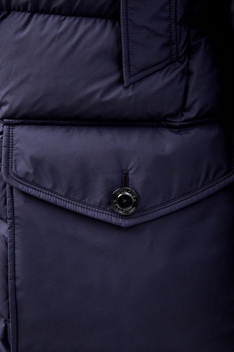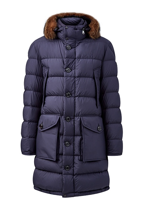 Удлиненный мужской пуховик от Moncler выполнен из матового водонепроницаемого нейлона в темно-синем цвете. Наполнитель из пуха и пера обеспечивает комфорт в условиях низких температур, а съемная окантовка из меха сурка на капюшоне не позволяет ветру проникать внутрь. Модель с четырьмя карманами и двойной линией застежки на пуговицы и молнию. Детали: кулиска на талии, подкладка из нейлона, кожаный логотип на рукаве. Длина по спинке 104 см.