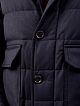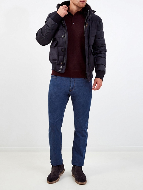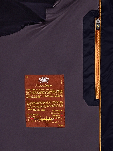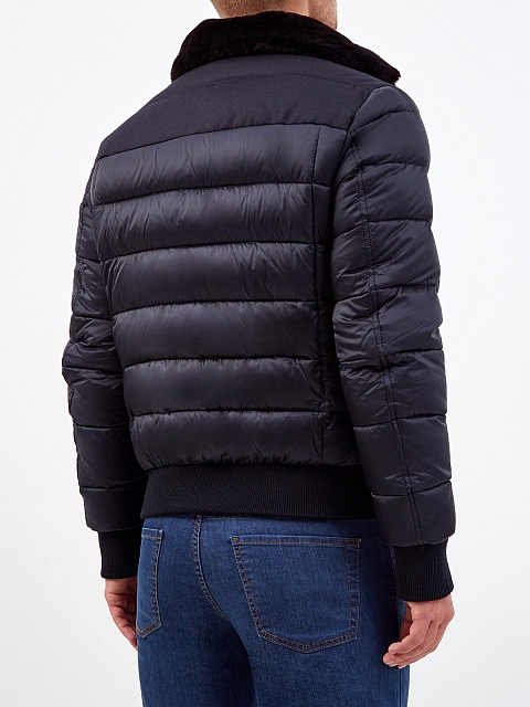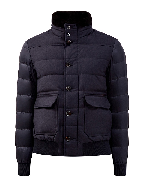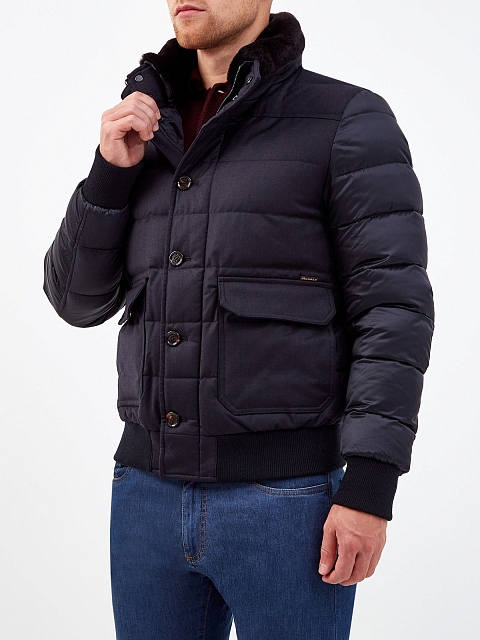 Комбинированный мужской пуховик от Moorer. Модель сочетает легкий технический нейлон с матовой поверхностью и плотную фланель. Высокий ворот с отделкой из густой овчины делает дизайн максимально универсальным, эластичные кромки в спортивном стиле дополнительно защищают от ветра. Детали: двойная линия застежки, широкие накладные карманы. Сделано в Италии.
