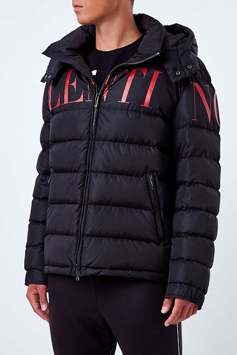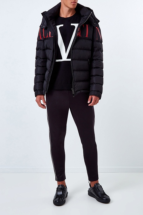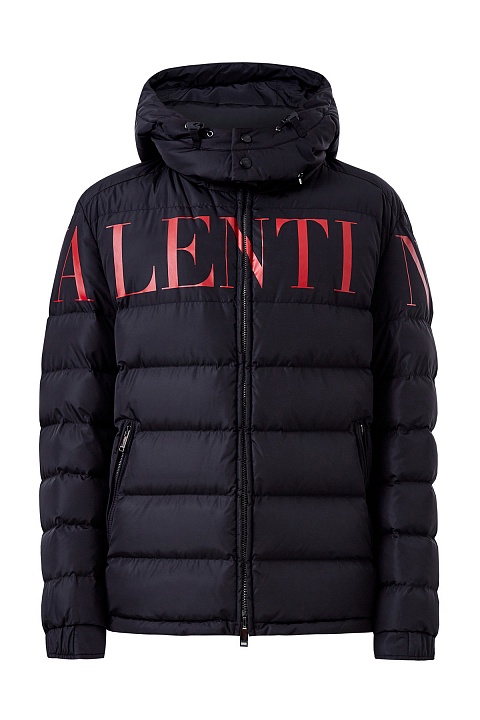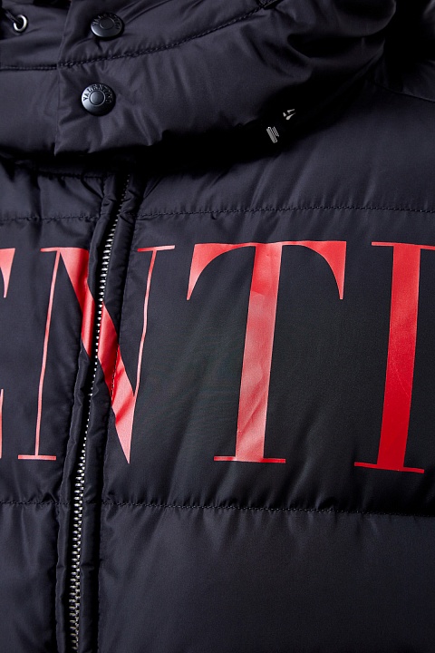 Мужской пуховик от Valentino из водоотталкивающего нейлона черного цвета. Яркой особенностью модели стала аппликация-монограмма бренда в контрастном оттенке «Rosso». Модель полностью на пуху и дополнена манжетами на рукавах, а также кулиской по нижнему краю для дополнительной защиты от низких температур. Детали: съемный капюшон, застежка-молния, прорезные карманы. Сделано в Италии.