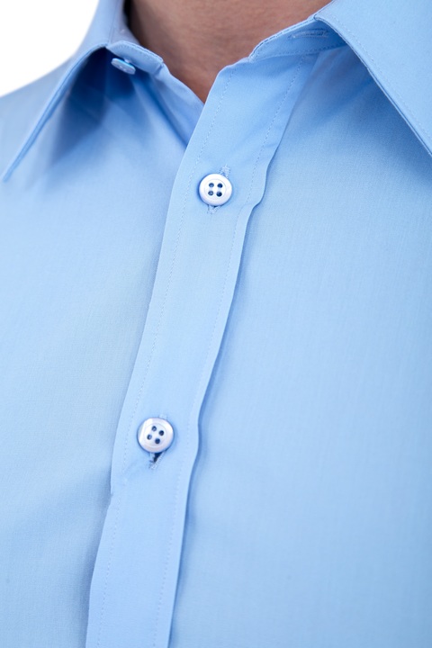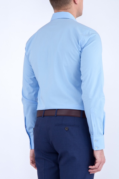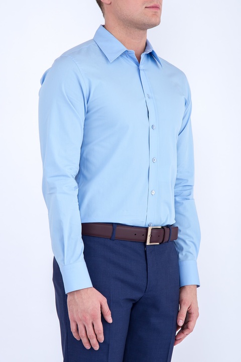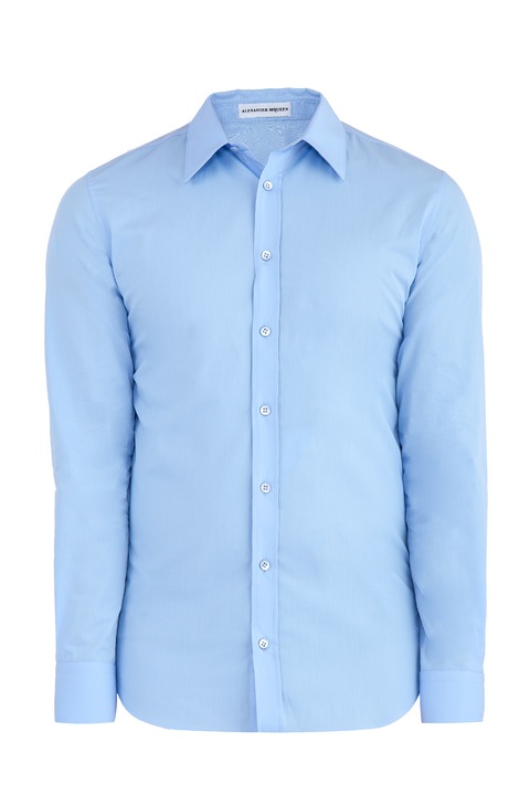 Классическая мужская рубашка Alexander McQueen облегающего кроя, выполненная из легкого хлопка нежно-голубого цвета. Модель характеризуется отложным итальянским воротом и длинными рукавами. Центральная планка застегивается на ряд пуговиц. Сделано в Италии.