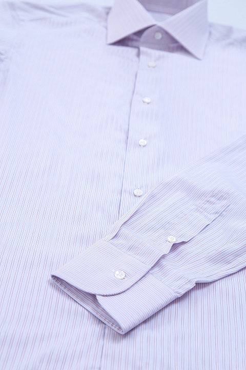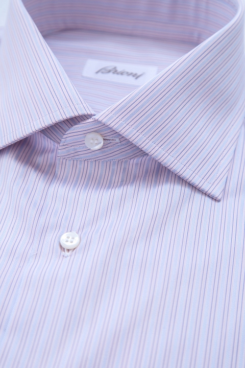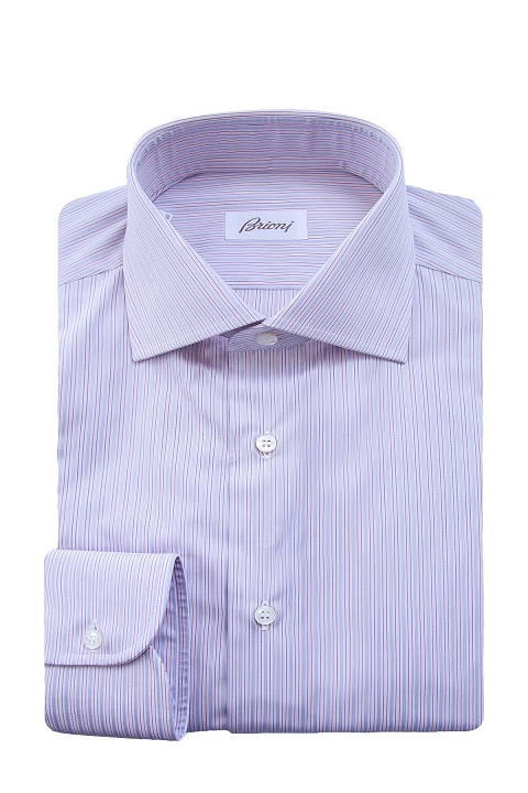 Классическая мужская рубашка Brioni, выполненная из легкого хлопка светло-сиреневого цвета. Модель декоративна узором в виде вертикальной полоски светло-голубого и синего оттенков. Изделие с французским отложным воротником на стойке. Манжеты и передняя планка застегиваются на пуговицы. Произведено в Италии.
