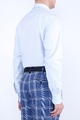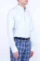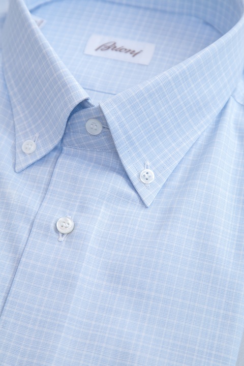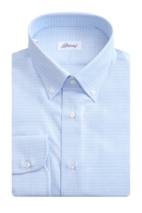 Мужская рубашка Brioni прямого кроя выполнена из легкого хлопка с повторяющимся узором в клетку в нежно-голубой гамме. Модель характеризуется итальянским отложным воротником "Баттен-даун" и длинными рукавами с плотными манжетами на пуговицах. Застежка осуществляется на ряд пуговиц в центральной планке. Сделано в Италии.