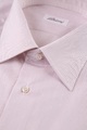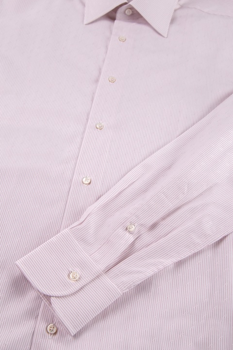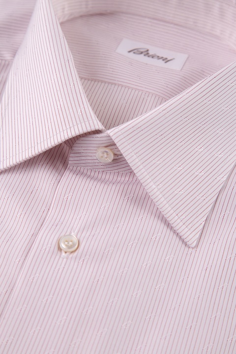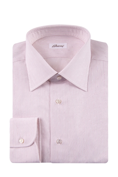 Элегантная мужская рубашка Brioni прямого кроя, выполненная из натурального дышащего хлопка светло-розового цвета с изящным узором в виде тонких вертикальных полос красного оттенка. Модель с длинными рукавами и традиционным итальянским отложным воротником. Центральная планка и широкие манжеты со скошенными уголками застегиваются на пуговицы. Произведено в Италии.