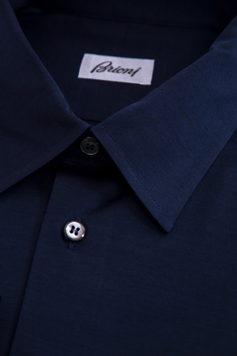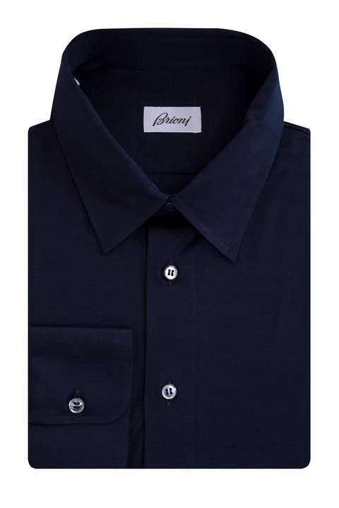 Лаконичная мужская рубашка Brioni приталенного кроя, выполненная из натурального плотного хлопка глубокого синего цвета. Модель с традиционным итальянским отложным воротником и длинными втачными рукавами, дополненными широкими манжетами. Центральная планка застегивается на пуговицы. Сделано в Италии.