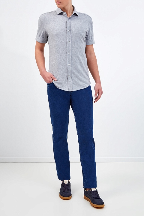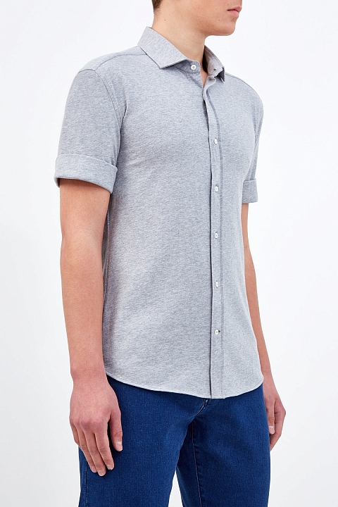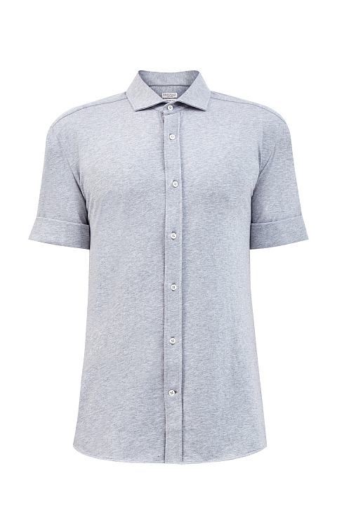 Базовая рубашка от Brunello Cucinelli из хлопкового джерси. Гладкие волокна собранного вручную хлопка придают поверхности мягкий сатиновый блеск. Эластичная и дышащая ткань остается комфортной в движении и идеально подходит для создания летних образов. Детали: застежка на планку с пуговицами из перламутра, отвороты на рукавах. Сделано в Италии.