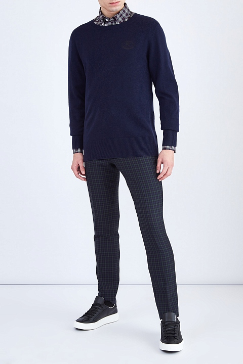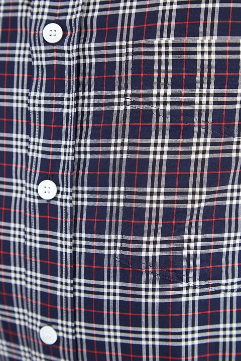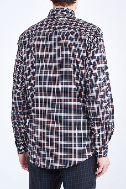 Мужская рубашка прямого свободного силуэта из коллекции осень-зима от Burberry создана из хлопкового поплина темного тона с повторяющимся контрастным принтом в мелкую клетку. Изделие с отложным воротником на стойке с пристегнутыми уголками, плотными манжетами и застежкой на планку с пуговицами. Расслабленный стиль сформирован слегка удлиненной спинкой и кромками с закругленными краями.