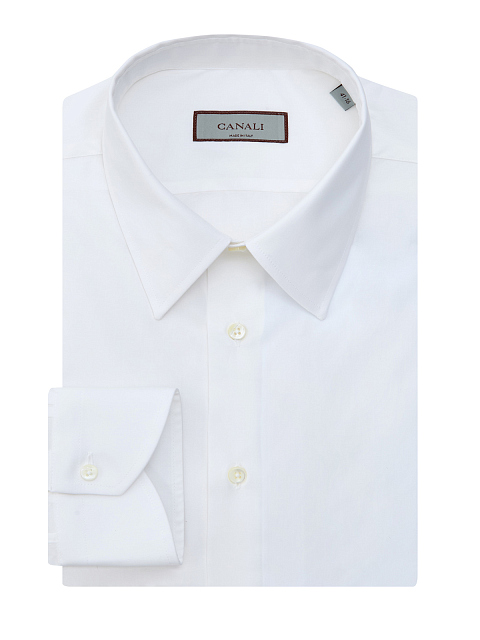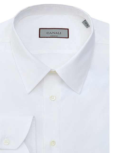 Мужская рубашка из гладкого хлопкового поплина от Canali представлена в универсальном белом цвете. Классический крой делает модель идеальным решением для создания комфортных аутфитов в рамках делового дресс-кода. Детали: отложной ворот, пуговицы из перламутра, закругленный нижний край. Сделано в Италии.