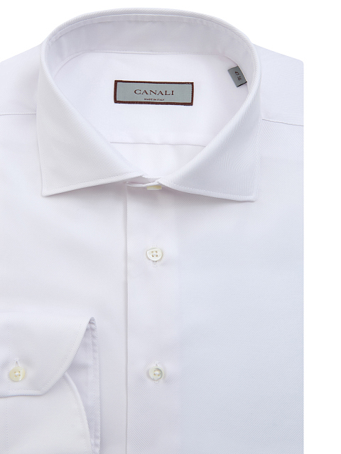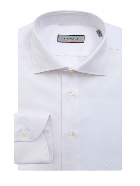 Универсальная мужская рубашка от Canali идеально подходит для создания элегантного повседневного или делового образа. Изделие выполнено вручную из белоснежного хлопкового твила с диагональным переплетением волокон. Модель с традиционным итальянским воротником, закругленными нижними кромками, плотными закругленными манжетами на длинных рукавах и застежкой на ряд пуговиц из перламутра. Сделано в Италии.