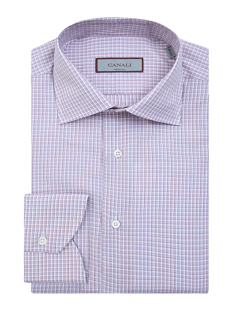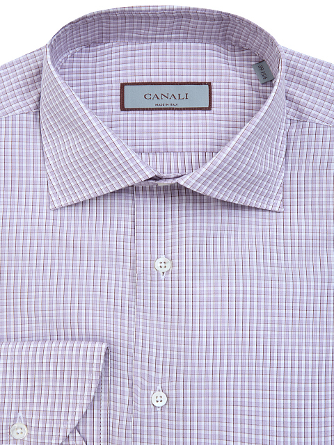 Рубашка из гладкого хлопкового поплина с принтом в клетку от Canali выполнена в лаконичной бело-лавандовой гамме. Классический крой делает модель идеальным решением для создания комфортных аутфитов в рамках дресс-кода. Детали: отложной ворот, пуговицы из перламутра. Сделано в Италии.