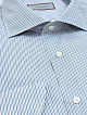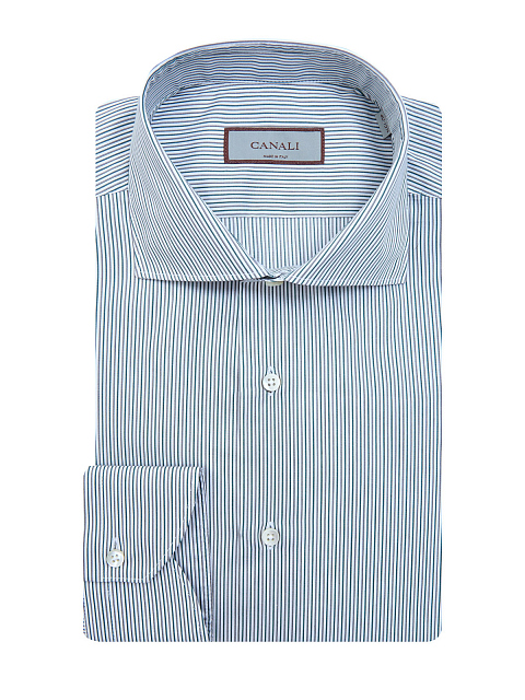 Рубашка из гладкого хлопкового поплина от Canali. Принт в тонкую вертикальную полоску бирюзового и серого оттенков выделяется на фоне базового белого цвета. Классический крой делает модель идеальным решением для создания комфортных аутфитов в рамках делового дресс-кода. Детали: отложной ворот, пуговицы из перламутра. Сделано в Италии.