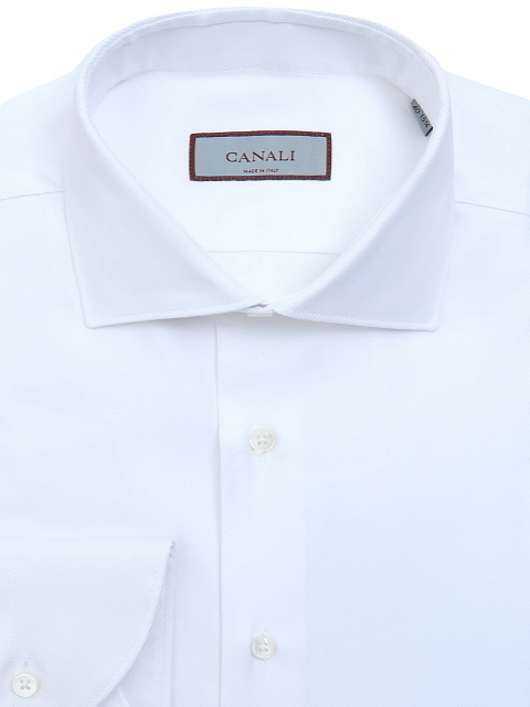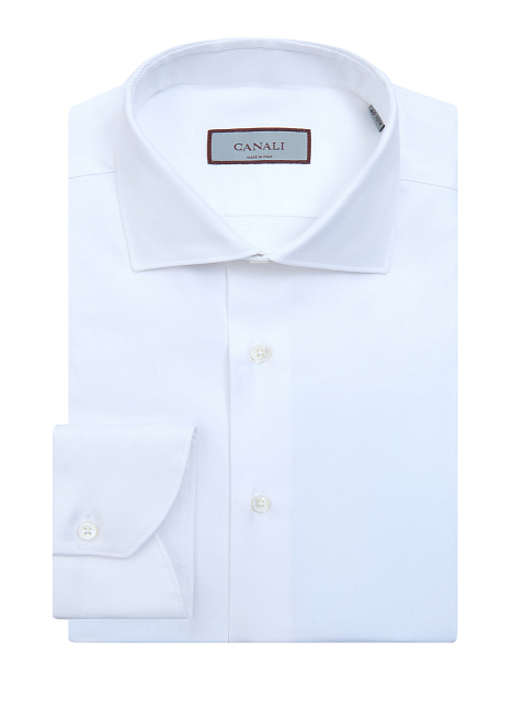 Универсальная мужская рубашка от Canali идеально подходит для создания элегантного повседневного или делового образа. Изделие выполнено вручную из белоснежного хлопкового твила с диагональным переплетением волокон. Модель с традиционным итальянским воротником, закругленными нижними кромками, плотными закругленными манжетами на длинных рукавах и застежкой на ряд пуговиц из перламутра. Сделано в Италии.