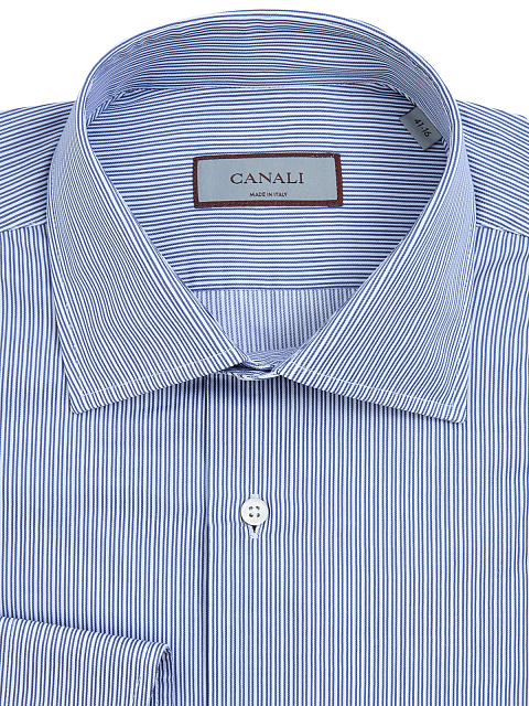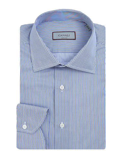 Мужская рубашка от Canali выполнена из эластичного хлопкового твила — выверенный состав ткани обеспечивает комфорт в движении, эластичные волокна в составе препятствуют образованию складок. Классический силуэт идеально подходит для создания деловых и повседневных образов. Детали: принт в тонкую вертикальную полоску, закругленный нижний край, отложной воротник, застежка на пуговицы из перламутра. Сделано в Италии.