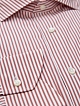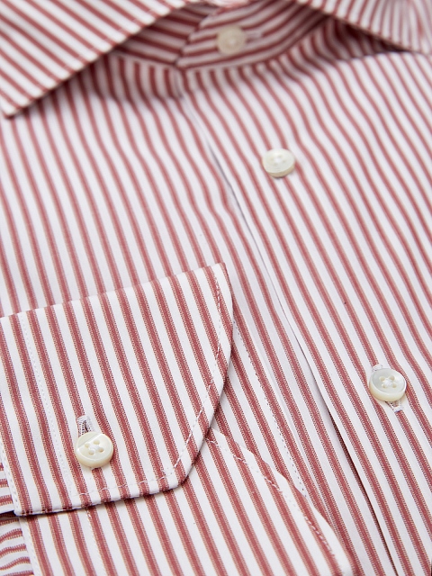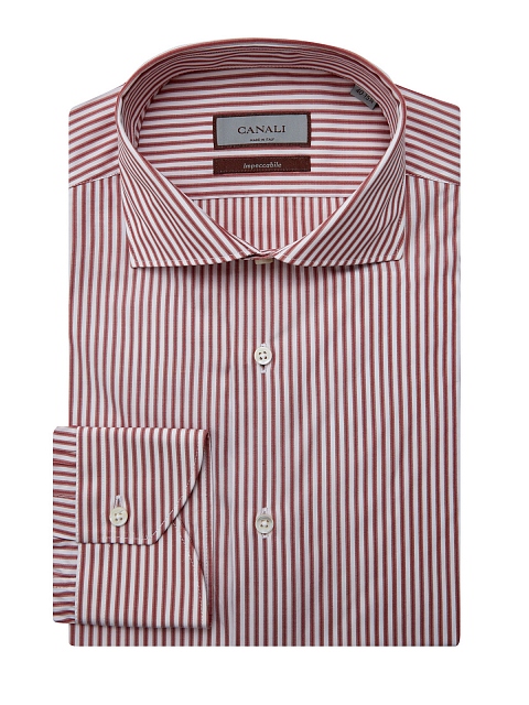 Рубашка из тонкого хлопка от Canali с принтом в полоску выполнена в лаконичной бело-красной гамме. Специальная обработка Impeccabile предотвращает образование складок и появление пятен. Классический крой делает модель идеальным решением для создания комфортных аутфитов в рамках делового дресс-кода. Детали: отложной ворот, пуговицы из перламутра, закругленный нижний край.