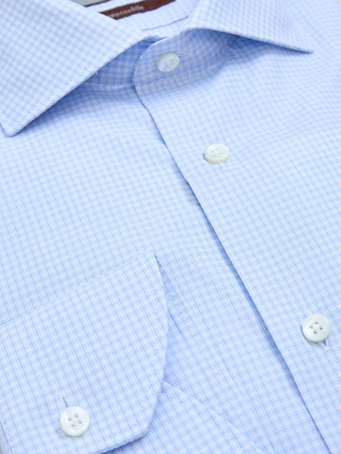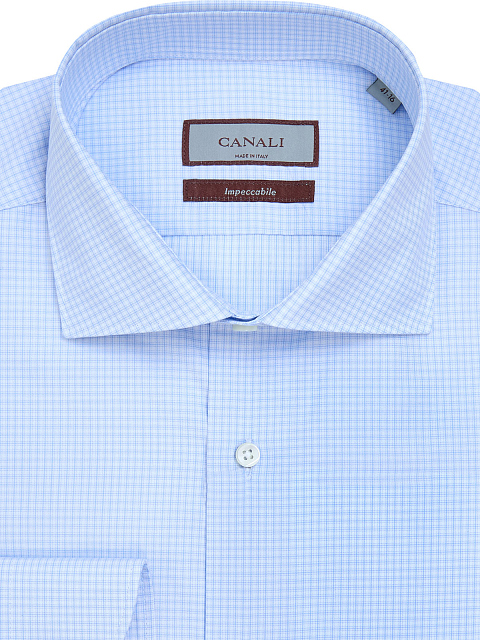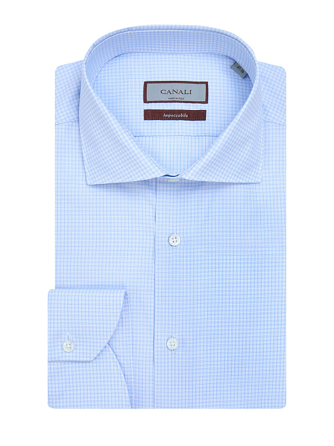 Рубашка из гладкого хлопкового поплина с принтом в клетку от Canali выполнена в лаконичной бело-голубой гамме. Полностью натуральная ткань обеспечивает максимальный комфорт и сохраняет форму благодаря специальной обработке Impeccabile. Классический крой делает модель идеальным решением для создания комфортных аутфитов в рамках дресс-кода. Детали: отложной ворот, пуговицы из перламутра. Сделано в Италии.