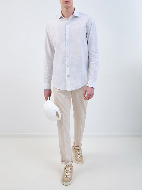 Мужская рубашка из коллекции Platinum от Eleventy выполнена из мягкой хлопковой ткани Albini. Полностью натуральный состав делает повседневные образы максимально комфортными. Принт в тонкую вертикальную полоску придает образу непринужденное настроение. Детали: закругленные нижние кромки, застежка на пуговицы из перламутра. Сделано в Италии.