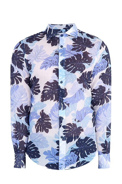 Легкая рубашка Ermanno Scervino приталенного силуэта выполнена из хлопкового муслина, украшенного сочным принтом из листьев фиолетовой гаммы. Модель с длинными рукавами, завершенными манжетами на пуговицах, классическим итальянским воротником и застежкой на пуговицы в тон. Сделано в Италии.