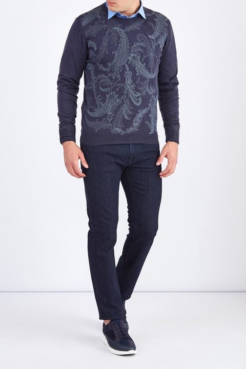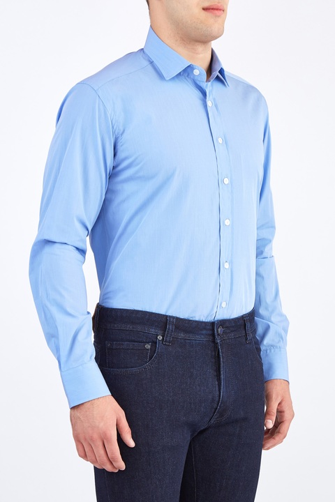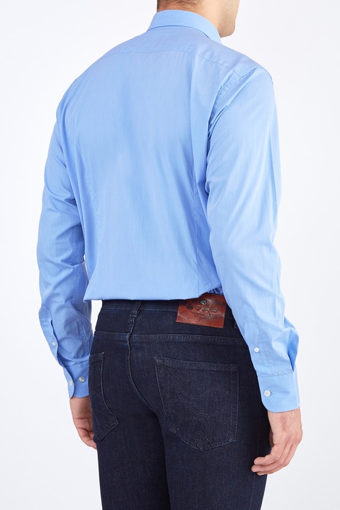 Классическая рубашка Etro прямого кроя выполнена из хлопка лазурно-голубого оттенка с вплетенными светлыми нитями, образуя многогранный цвет. Модель с воротником «Кент» и длинными рукавами с плотными манжетами. Вся фурнитура дополнена лаконичной символикой Модного дома. Сделано в Италии.