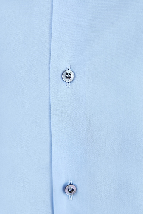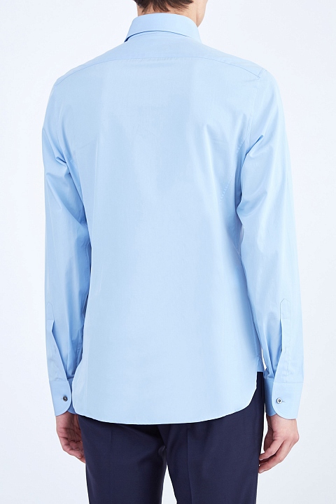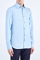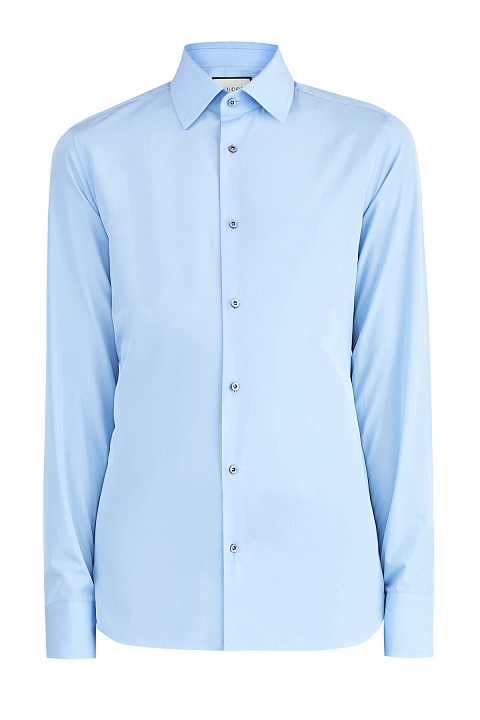 Классическая мужская рубашка Gucci приталенного кроя, выполненная из эластичного хлопкового поплина лазурно-голубого цвета. Модель с уплотненными манжетами и отложным итальянским воротом с остроконечными уголками. Застежка осуществляется на ряд контрастных пуговиц в центральной планке и на рукавах. Сделано в Италии.