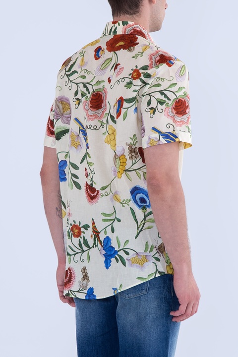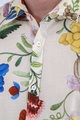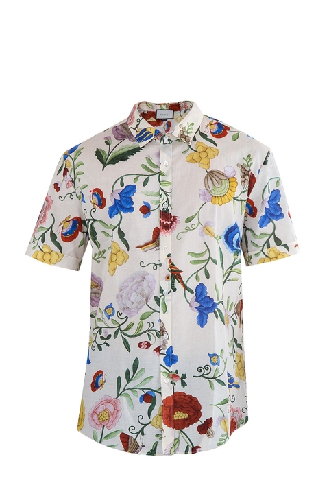 Яркая рубашка прямого силуэта из коллекции Gucci. Модель выполнена из натурального легкого хлопка кремового оттенка с сочным цветочным принтом. Изделие с традиционным итальянским воротником и короткими втачными рукавами. Застежка осуществляется на пуговицы на передней планке. Сделано в Италии.