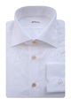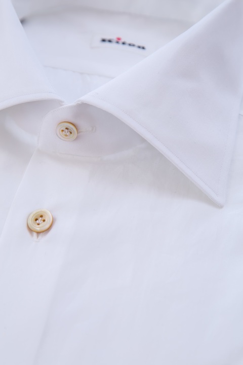 Элегантная мужская рубашка Kiton прямого кроя выполнена из натурального хлопка кипельно-белого цвета без декоративных элементов. Модель с отложным воротником "Акула" на стойке, центральной планкой и манжетами длинных втачных рукавов с застежкой на пуговицы с перламутровыми переливами. Произведено в Италии.