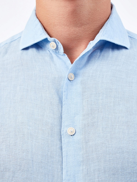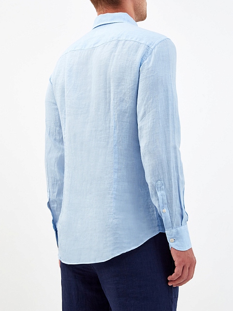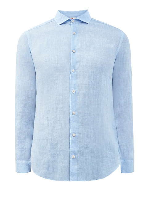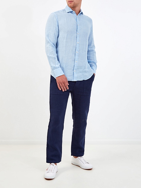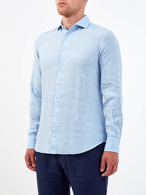 Лаконичная мужская рубашка от MC2 Saint Barth выполнена из тонкой льняной ткани, переплетение нитей разной плотности придает поверхности легкий неоднородный эффект. Модель в светло-голубом оттенке дополнена отложным воротником и застежкой на пуговицы. Детали: закругленные нижние кромки, длинные рукава с манжетами.