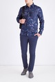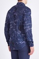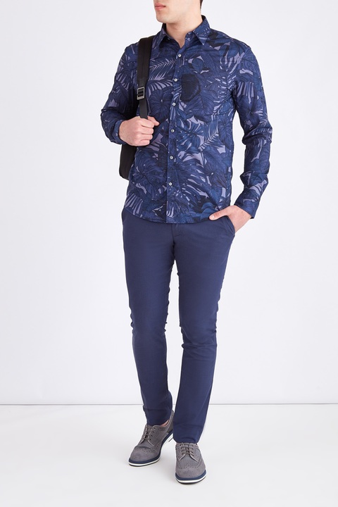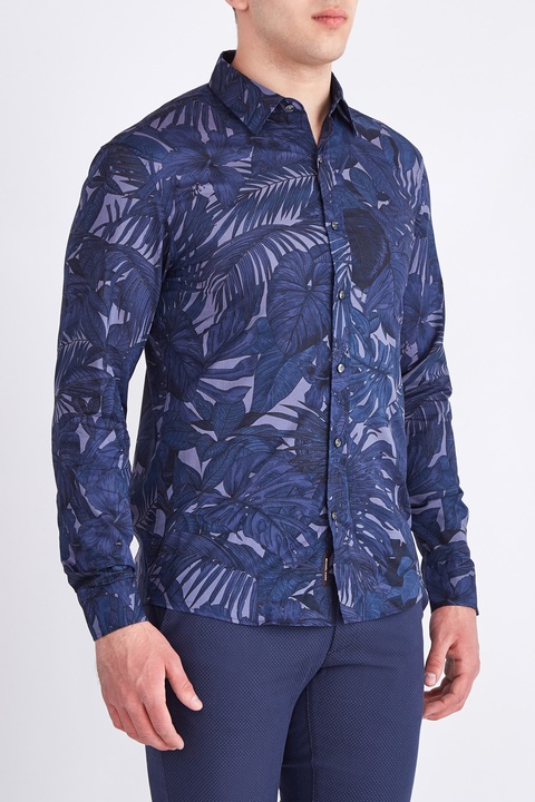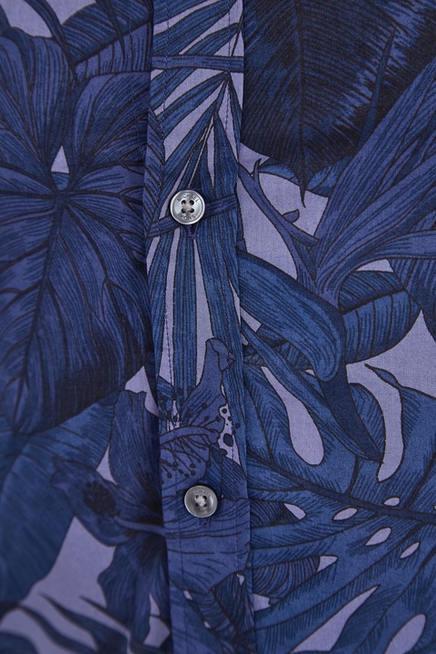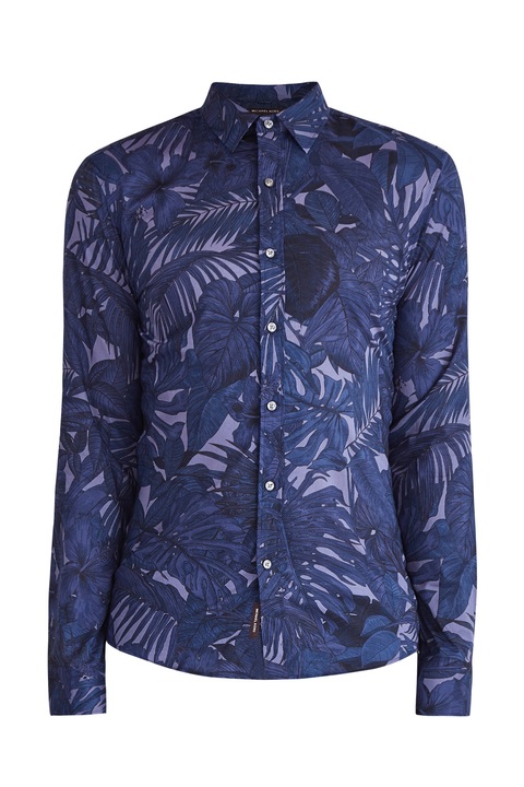 Яркая мужская рубашка приталенного силуэта из весенне-летней коллекции Michael Kors выполнена из дышащего хлопка в пастельном фиолетовом оттенке с декором набивным принтом с изображением пальмовых листьев в чернильно-синих тонах. Модель классического кроя дополнена традиционным отложным воротником, манжетами, кокеткой на спинке и асимметричной закругленной нижней кромкой. Изделие оснащено застежкой на ряд пуговиц с тисненой монограммой бренда.