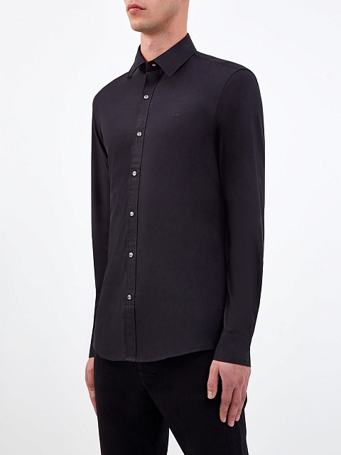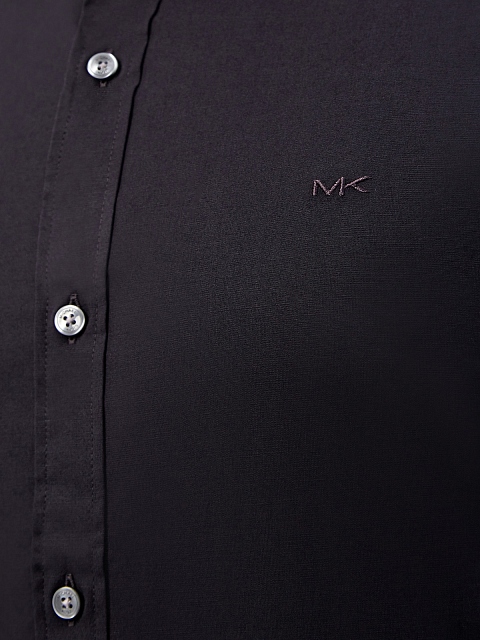 Лаконичная мужская рубашка в универсальном черном цвете от Michael Kors выполнена из эластичного дышащего хлопка. Модель кроя Slim Fit дополнена аккуратным итальянским отложным воротником на стойке и длинными рукавами. Вытачки обеспечивают комфортную посадку по фигуре, застежка на перламутровые пуговицы на передней планке перекликается с фурнитурой уплотненных манжет. Вышитый логотип с монограммой бренда завершает дизайн.