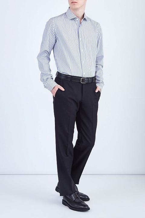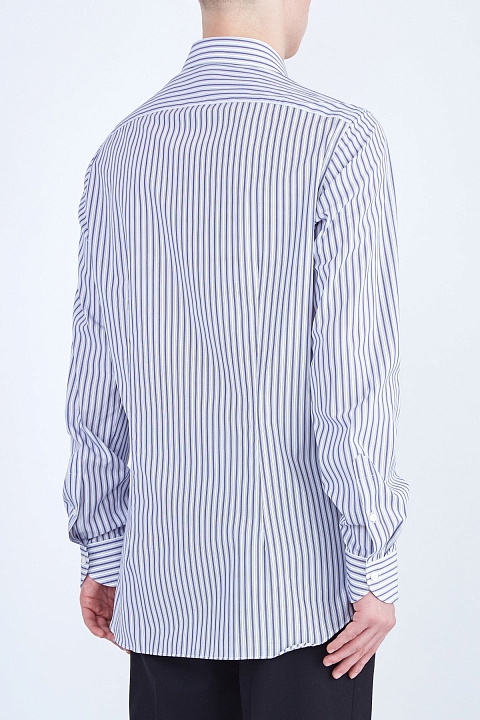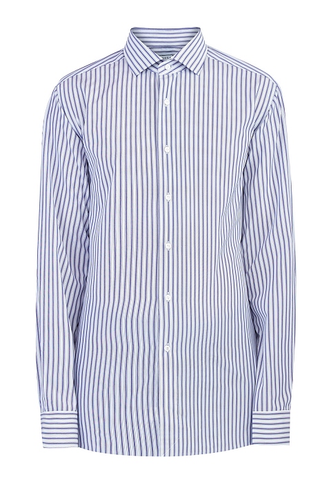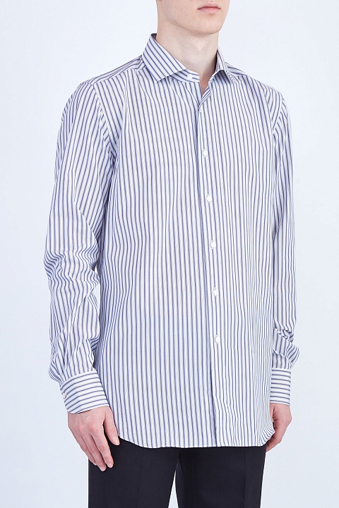Мужская рубашка бренда Xacus с кроем tailor fit со слегка приталенной посадкой, но не облегающей тело, и не стесняющей движения. Модель с отложным воротником cutaway и скругленными манжетами сшита из хлопкового поплина Supercotone белого цвета с темно-синими полосами разной толщины. Ткань Supercotone, разработанная брендом, обладает насыщенными стойкими цветами и приятной телу мягкой текстурой. Сделано в Италии