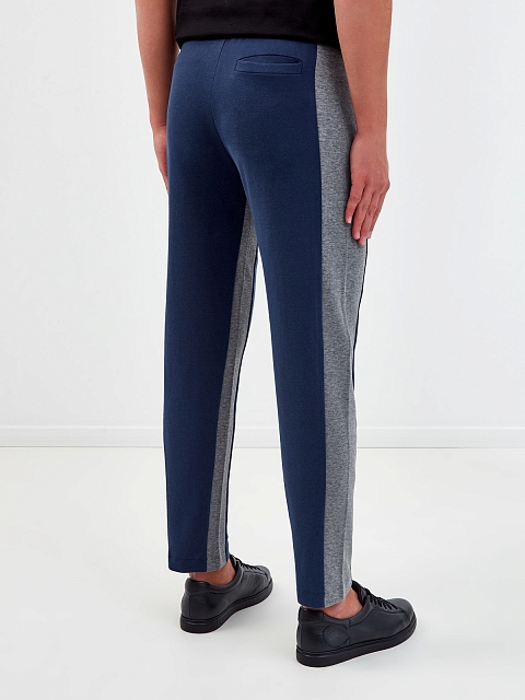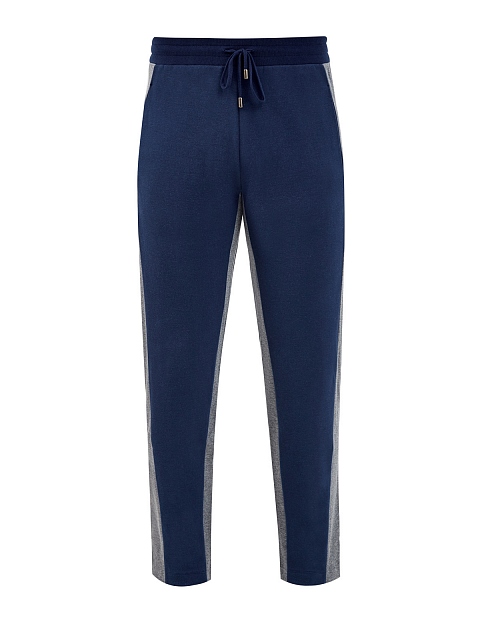 Спортивные брюки от Canali выполнены из плотного хлопка интерлок — ткани с гладкой фактурой джерси с обеих сторон. Натуральный состав обеспечивает максимальный комфорт и подходит для активного отдыха, путешествий и занятий спортом. Свободный крой не стесняет движений. Динамику образу придают широкие лампасы контрастного серого цвета. Детали: эластичный пояс, прорезные карманы. Сделано в Италии.