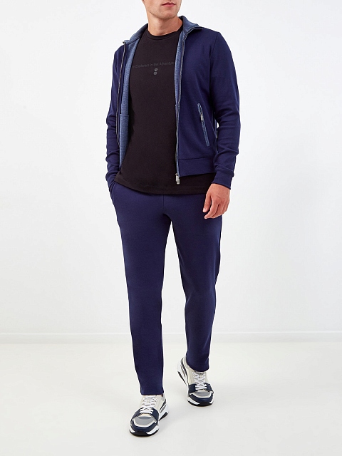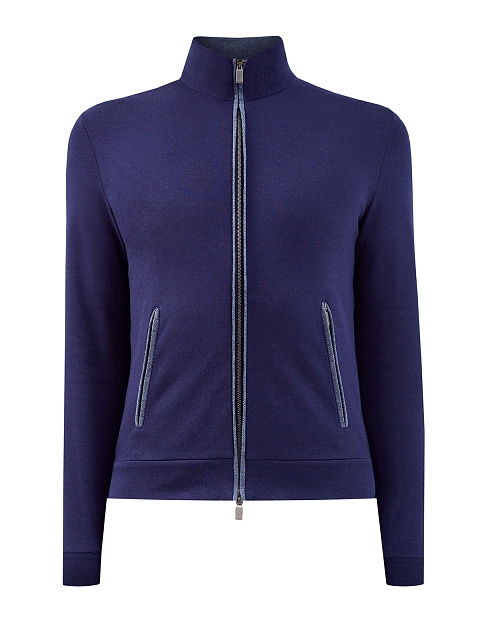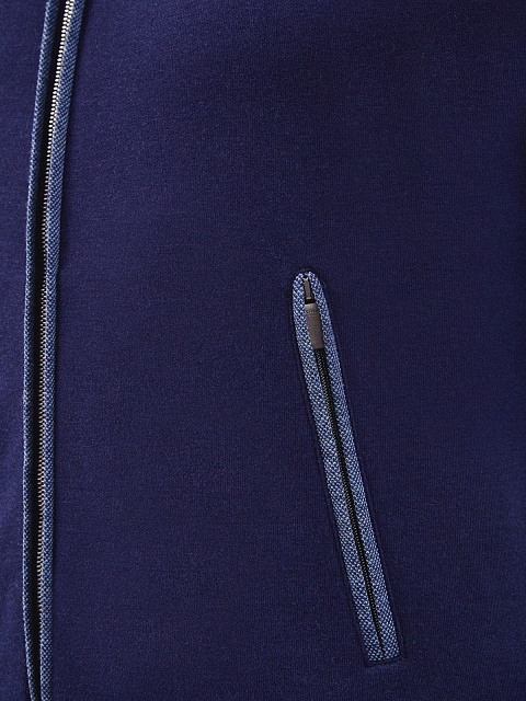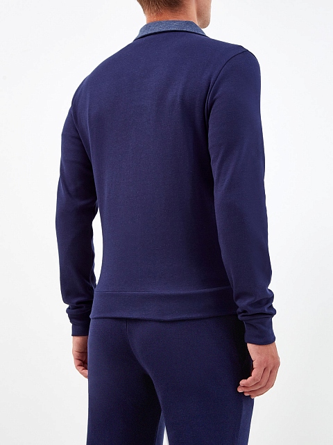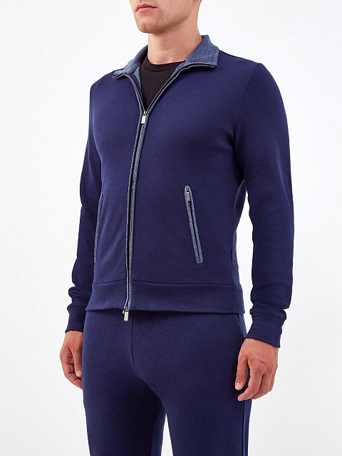 Мужская толстовка в спортивном стиле от Canali. Модель выполнена из хлопка интерлок — ткани с гладкой фактурой джерси с обеих сторон. Натуральный состав обеспечивает максимальный комфорт и идеально подходит для активного отдыха и путешествий. Слегка облегающий фигуру крой не стесняет движений, сочетание двух оттенков синего придает образу динамику. Детали: воротник-стойка, застежка-молния, два кармана. Сделано в Италии.