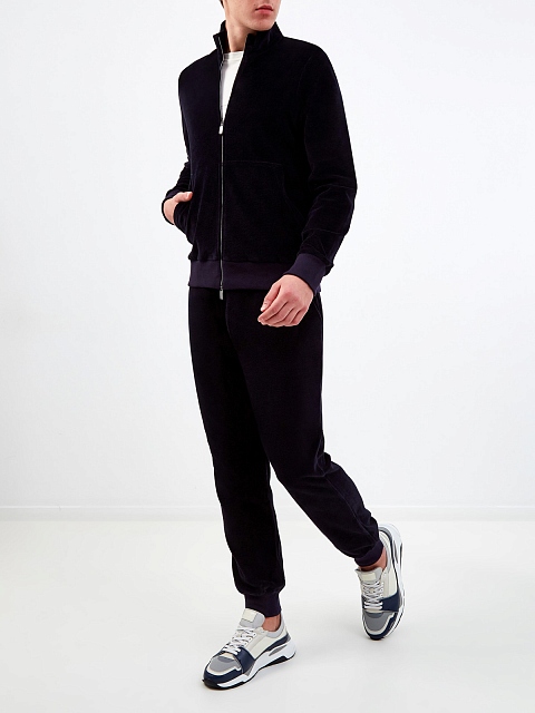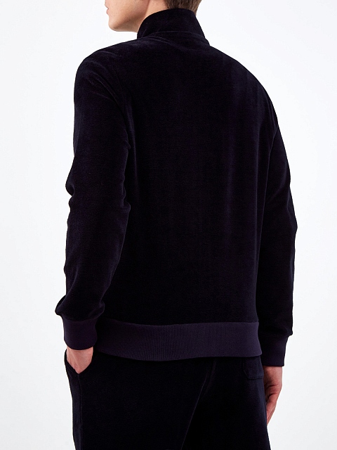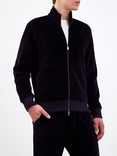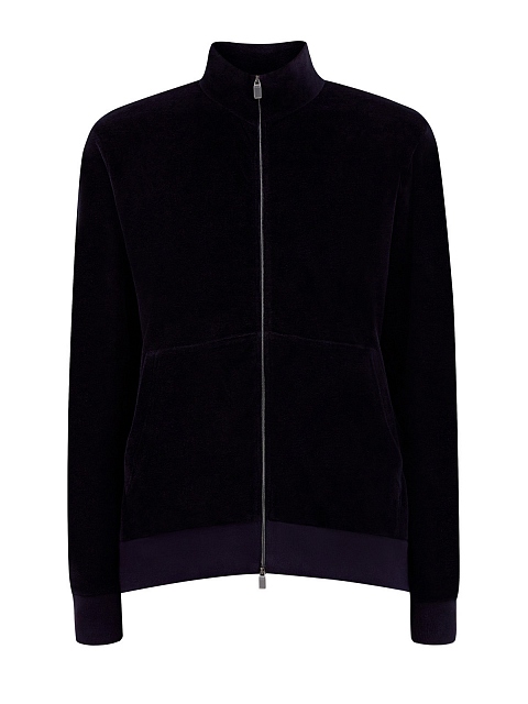 Стильная мужская толстовка от Canali выполнена в оттенке ночного неба из мягкого хлопкового бархата. Застежка-молния с двойным брендированным пуллером придает образу динамику, а манжеты и нижний край из эластичного трикотажа обеспечивают комфортную посадку. Детали: воротник-стойка, два прорезных кармана. Сделано в Италии.