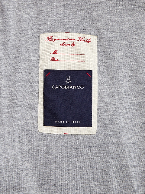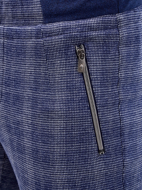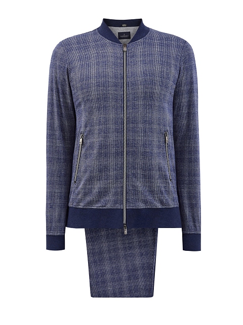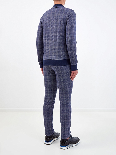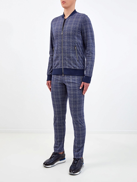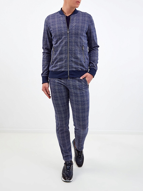 Стильный мужской костюм от Capobianco полностью выполнен из гладкого мерсеризованного хлопка, подкладка из джерси обеспечивает максимальный комфорт в движении. Неформальный штрих в образ вносит all-over узор с переплетением синих и белых нитей. Толстовка на молнии с двойным пуллером дополнена воротом-стойкой, брюки слегка зауженного кроя оснащены комфортным поясом. Детали: прорезные карманы на молниях, брендированная фурнитура. Сделано в Италии.