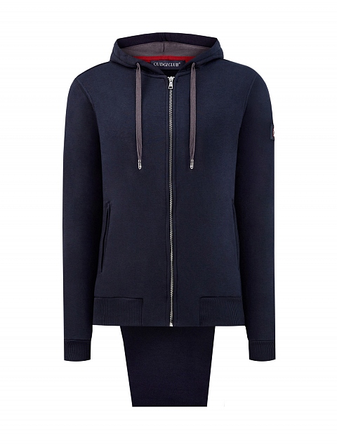 Спортивный костюм от Cudgi выполнен из хлопкового интерлока в оттенке индиго. Эластичная и дышащая ткань с фактурной внутренней поверхностью идеально подходит для поездок, активного отдыха и занятий спортом. Толстовка дополнена капюшоном на кулиске и эластичной отделкой кромок для точной посадки по фигуре. Прямые брюки оснащены комфортным поясом. Патч с логотипом бренда завершает дизайн.