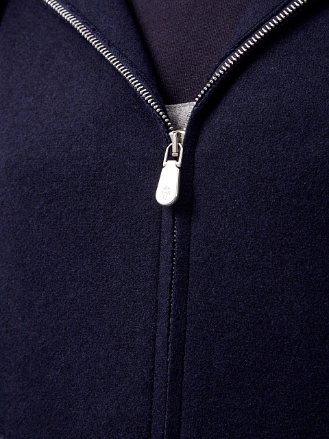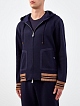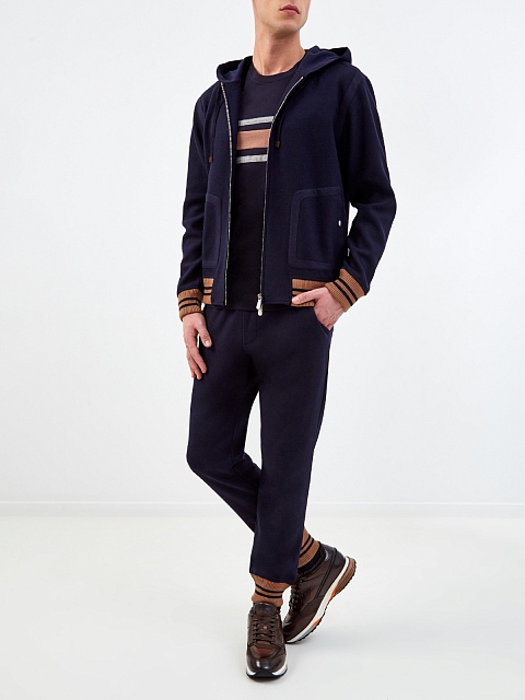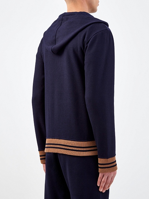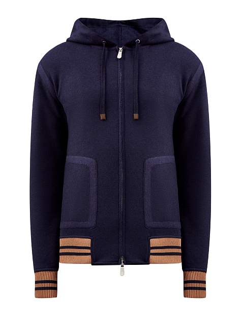 Спортивная мужская толстовка от Eleventy. Модель выполнена из плотной шерстяной ткани в насыщенном оттенке индиго. Натуральный материал не стесняет движений и подходит как для путешествий, так и для активного отдыха. Эластичные манжеты и нижний край дополнены контрастным узором в бежевом цвете. Детали: глубокий капюшон, застежка на молнию, накладные карманы. Сделано в Италии.