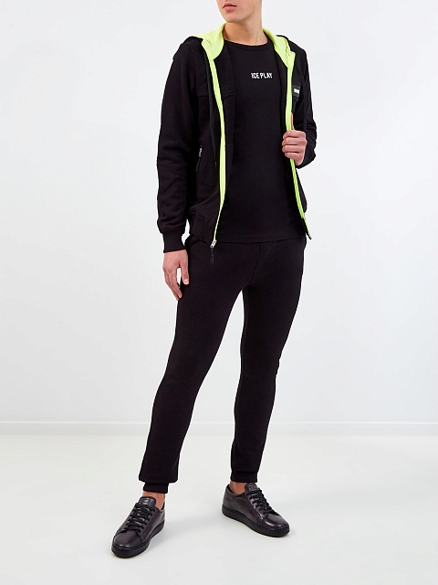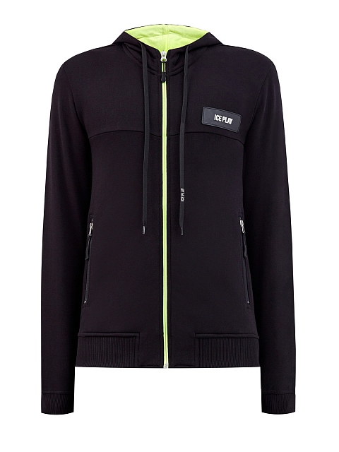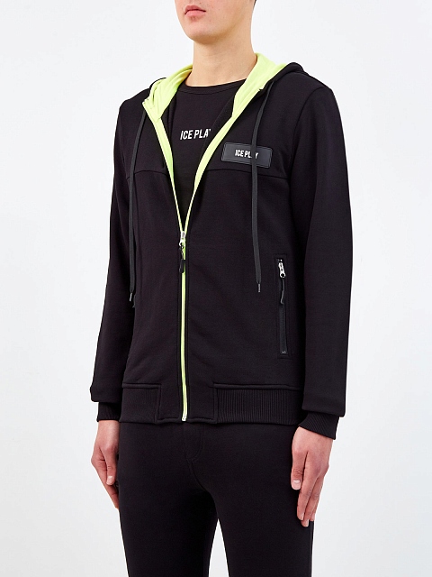 Спортивная толстовка от Ice Play выполнена из плотного хлопкового футера в универсальном черном цвете. Особенностью модели стала контрастная отделка внутренней поверхности в неоново-зеленом оттенке. Фирменный штрих — патч с логотипом бренда на передней планке. Детали: глубокий капюшон на кулиске, эластичная окантовка кромок в рубчик, прорезные карманы на молниях по бокам.