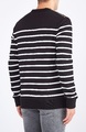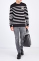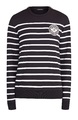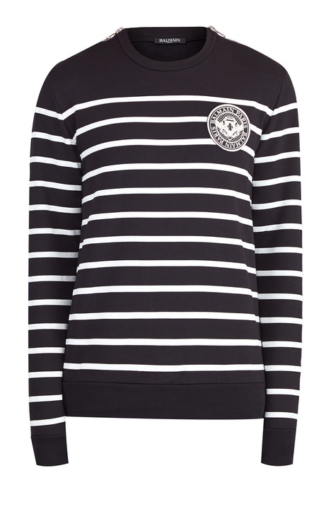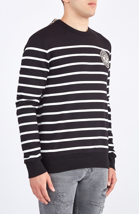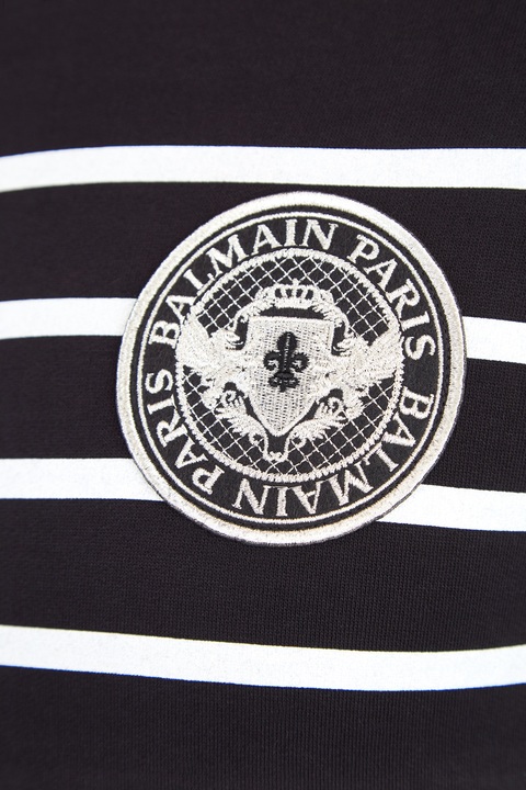 Мужской свитшот прямого кроя из коллекции осень-зима Balmain выполнен из теплой и мягкой хлопковой ткани черного цвета и дополнена набивным принтом в полоску в белой гамме, сохраняя симметрию а длинных рукавах. Передняя планка изделия декорирована аппликацией-нашивкой с гербовой символикой бренда. Круглый вырез горловины, манжеты рукавов и нижняя кромка окантованы эластичной хлопковой резинкой для комфортной посадки.