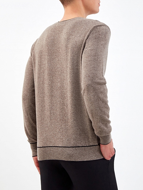 Лаконичный джемпер от Bertolo Cashmere представлен в сдержанной коричневой гамме. Для создания модели была выбрана тонкая шерстяная пряжа с волокнами кашемира и шелка, которые придают поверхности благородный сатиновый блеск. Передняя планка дополнена фактурным геометрическим принтом и вносит в образ оригинальный акцент. Детали: контрастная окантовка, эластичная отделка манжет и нижнего края. Сделано в Италии.