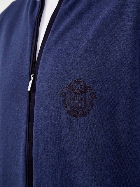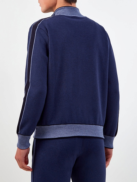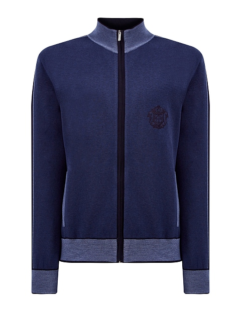 Толстовка из плотного хлопка, шерсти и шелка от Bertolo Cashmere выполнена в глубоком темно-синем оттенке. Полностью натуральный состав и комфортный крой делают модель идеальной для поездок и активного отдыха. Контрастная отделка вносит в образ динамичный акцент. Детали: эластичные манжеты, нижний край и ворот, вышитый герб, застежка-молния, два кармана. Сделано в Италии.